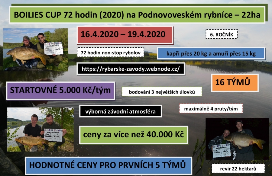 Zveme všechny soutěživé rybáře na další ročník závodu Boilies Cup na Podnovoveském rybníce v roce 2020. Více informací na https://rybarske-zavody.webnode.cz/